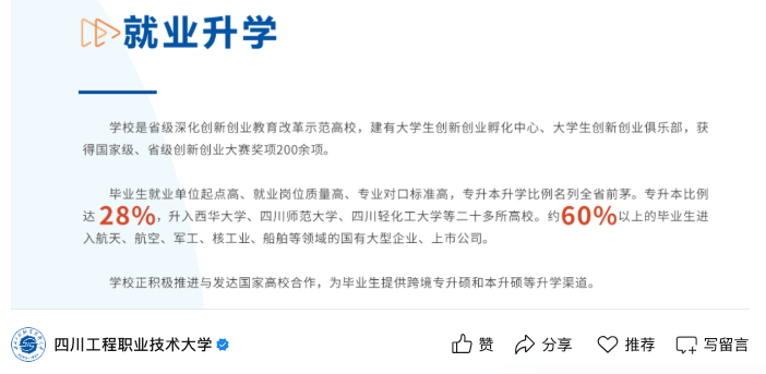 并且,学校的登科分数线年高考登科中,贵州物理类智能制制工程最低登科分为495。就好比四川工程职业手艺大学这所高校,结业生可是有60%以上都能进入航天、航空、军工、核工业、