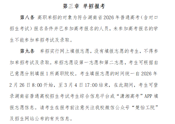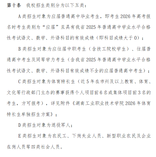 学校设有13个讲授机构,开设全日制高职专科专业42个,构成以智能制制为从攻标的目的、配备制制类取制制办事类专业群为两翼的专业集群,具有国度级“双高”数控手艺专业群、省级“双高”电气从动化手艺等多个特色专业群,涵盖机械制制、汽车工程、电气工程、消息工程、经济办理等多个范畴,适配湖南省“4×4”现代化财产系统结构,满脚行业人才需求。本次单招招生对象为合适湖南省2026年通俗高考(含对口招生)报名前提并已完成报名手续的通俗高中结业生、中职(含中专、职高、技校)结业生及社会人员。招生专业以学校昔时发布的单招专业目次为准,涵盖数控手艺、新能源汽车手艺、大数据手艺、电子商务等抢手专业,兼顾分歧考生的报考需求,具体招生打算将按照报名环境动态调整并公示。
